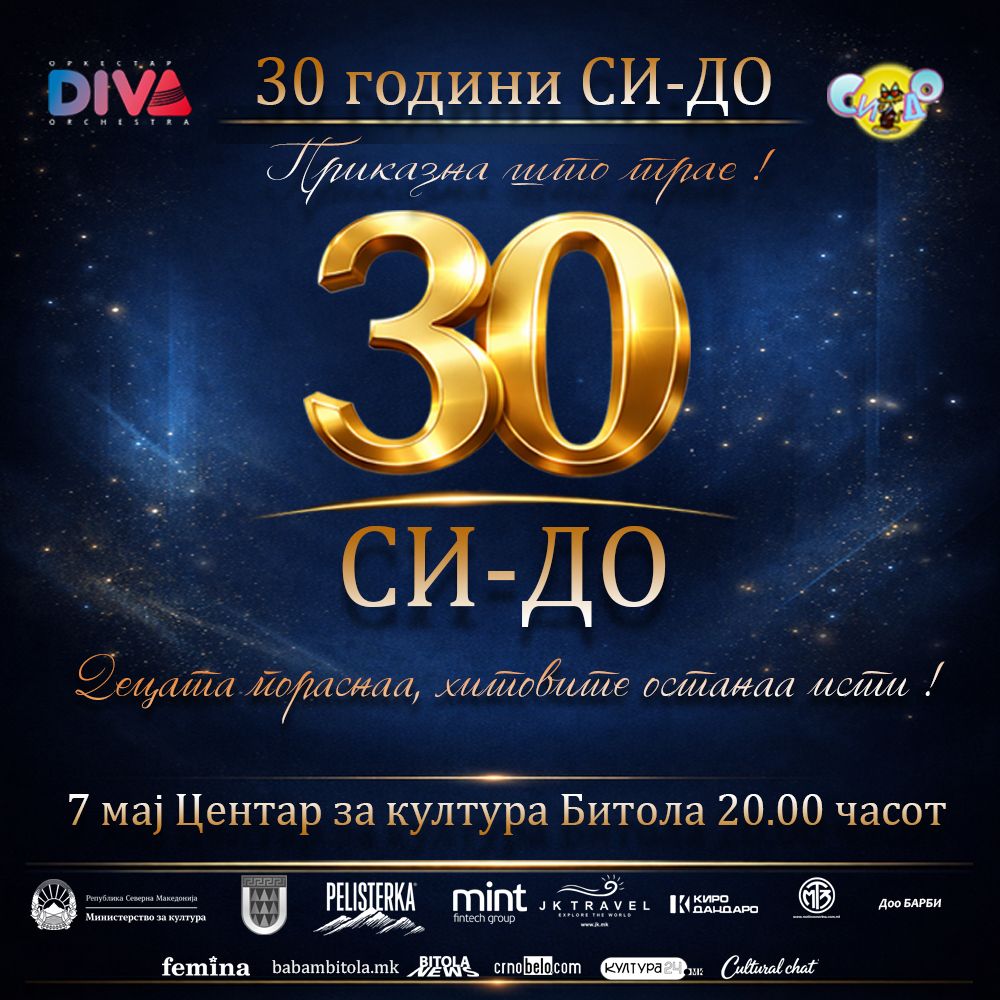 СИ-ДО – приказна што трае! Во чест на 30-годишнината, публиката ќе има ретка можност повторно да ги слушне оригиналните изведувачи на безвременските детски хитови од минатото, заедно со Оркестар DIVA. Песните што некогаш одекнуваа низ домовите, училиштата и срцата на децата, повторно ќе зазвучат – овојпат со уште посилна емоција и носталгија. Ова е можност за сите генерации кои израснале со овие мелодии да се потсетат на безгрижните денови, да ги споделат спомените и да создадат нови, заедно со најмладите. Не пропуштајте го настанот што ги поврзува минатото и сегашноста – „СИ-ДО“ повторно обединува генерации!